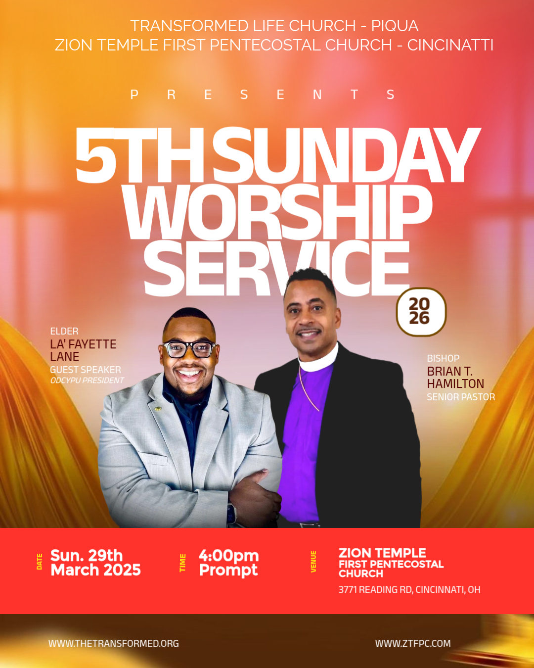 Transformed Life Church and Zion Temple Fist Pentecostal Church will be hosting a Sunday Worship Service on Sunday, March 29, 2026. The service will start promptly at 4:00 P.M. Elder La’Fayette Lane will be the guest speaker.