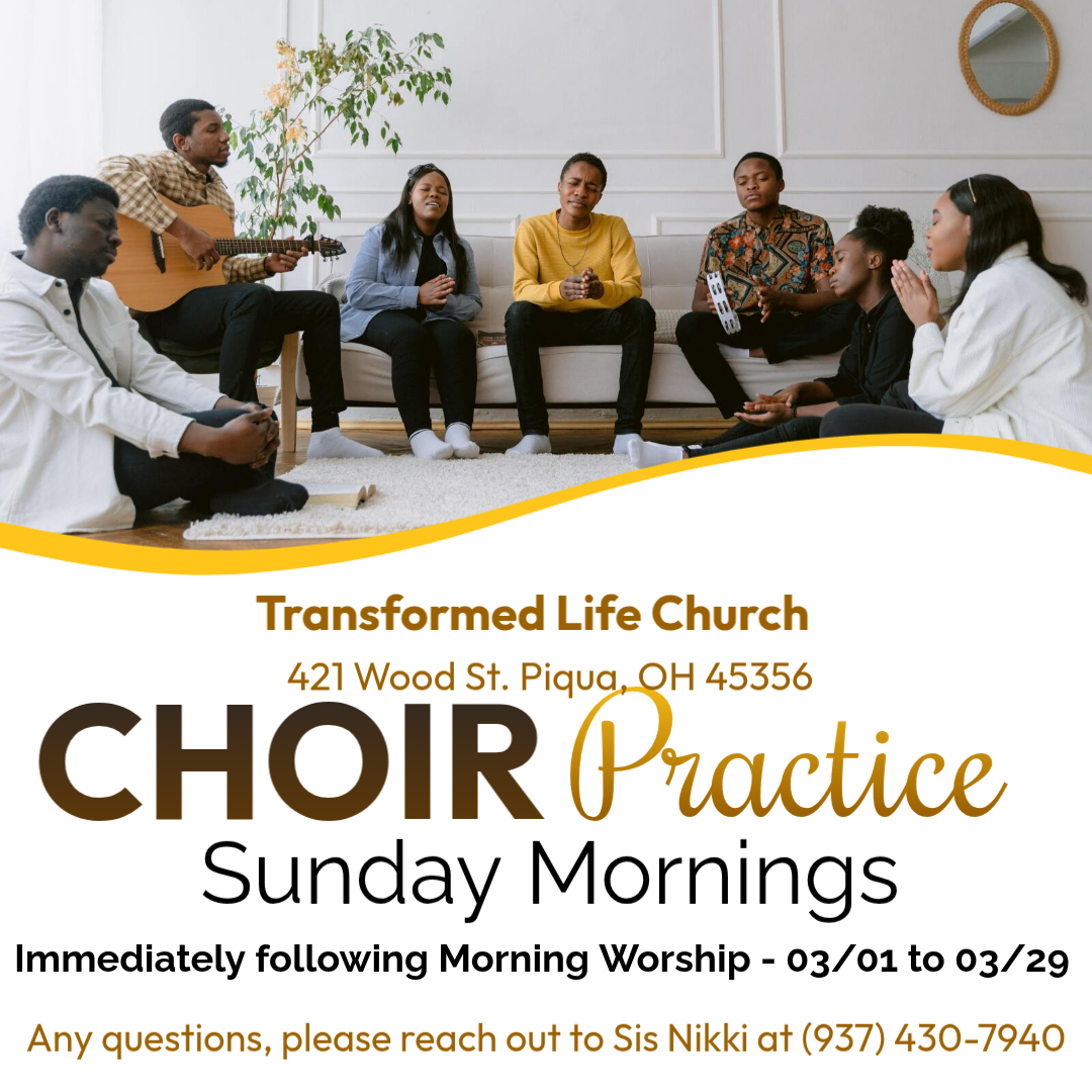 Choir Practice will be held on Sunday morning immediately following the morning worship. Please reach out to Sister Nikki if you have any questions (937-430-7940).