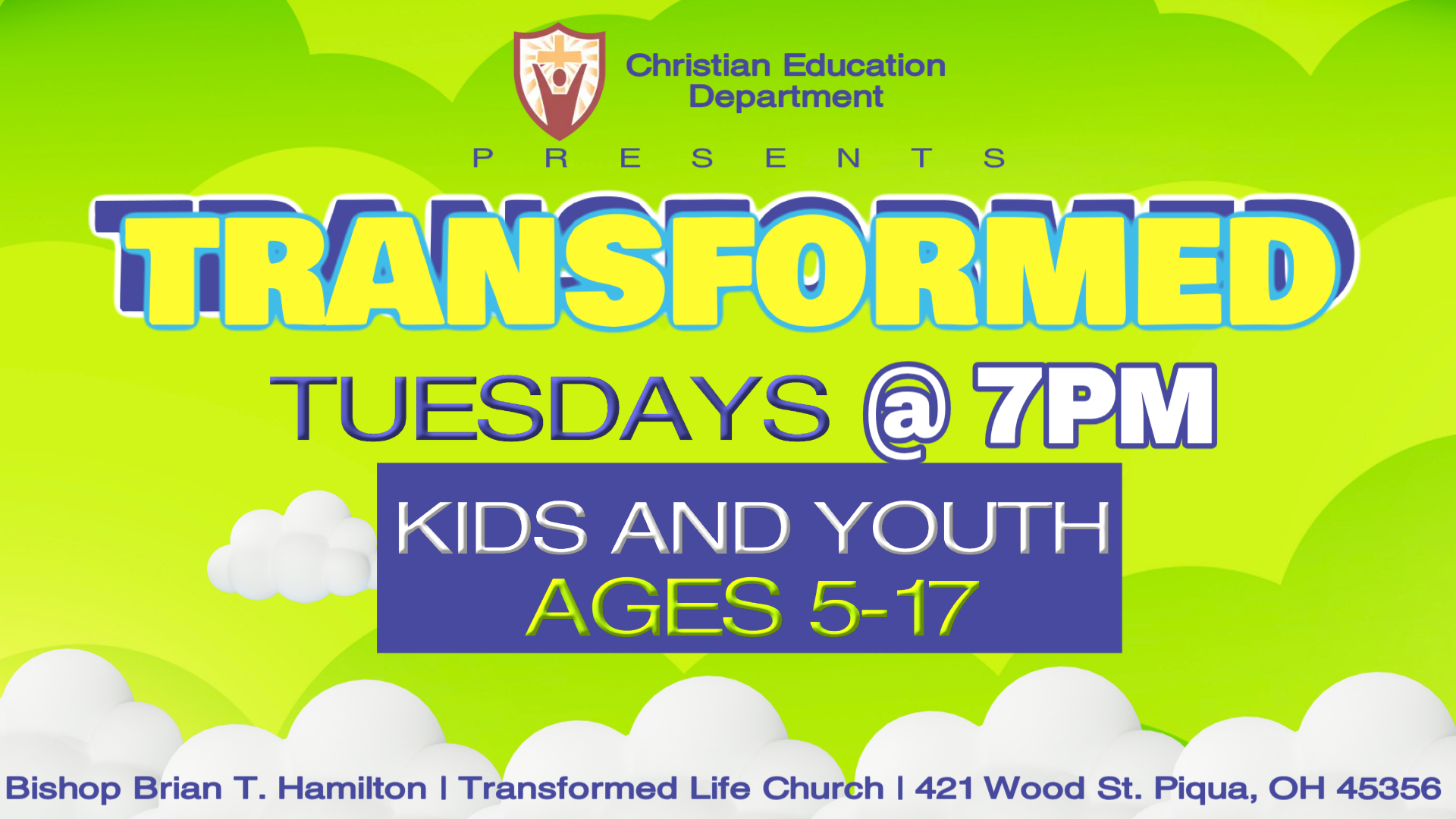 Kids & Youth Meeting Christian Education Department presents Transformed Tuesdays for Kids and Youth (ages 5-17). + Add to Google Calendar + iCal / Outlook export 00 days 00 hours 00 minutes 00 seconds Date Mar 10 2026 Time 7:00 pm - 8:00 pm Local Time Timezone: America/New_York Date: Mar 10 2026 Time: 7:00 pm - 8:00 pm Location Transformed Life Church 421 Wood St, Piqua, OH 45356, USA Next Occurrence Go to occurrence page Date Mar 17 2026 Time 7:00 pm - 8:00 pm Share this event