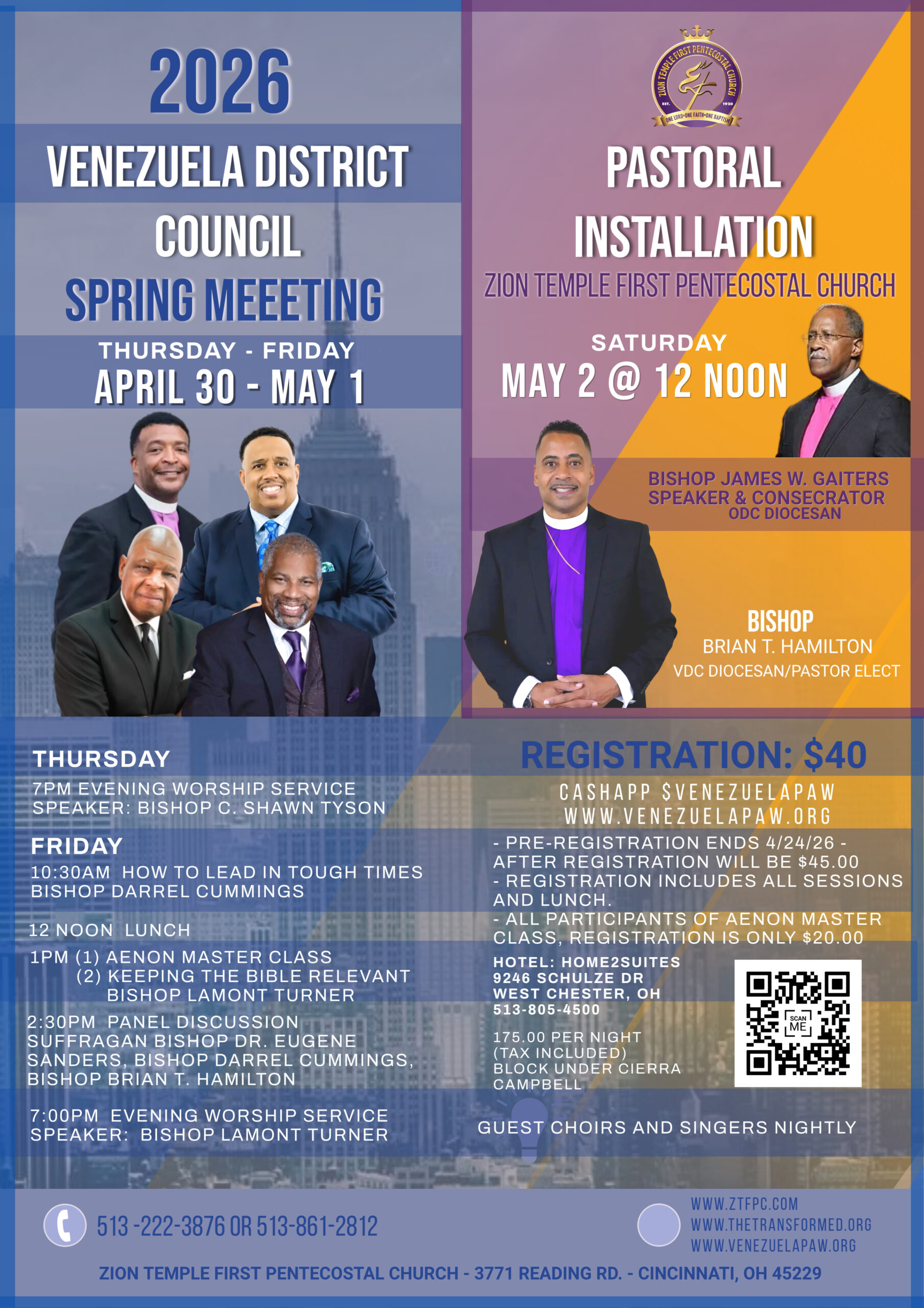 The 2026 Venezuela District Council Spring Meeting will be held on Thursday, April 30 and Friday, May 1, 2026. The event will be held at Zion Temple First Pentecostal Church, 3771 Reading Rd., Cincinnati, Oh 45229. The pre-registration fee is $40.00 and includes all the sessions and lunch on Friday. Pre-registration ends on April 24, 2026. After that date the cost is $45.00. If you are an AENON Master Class participant, the cost is only $20.00.